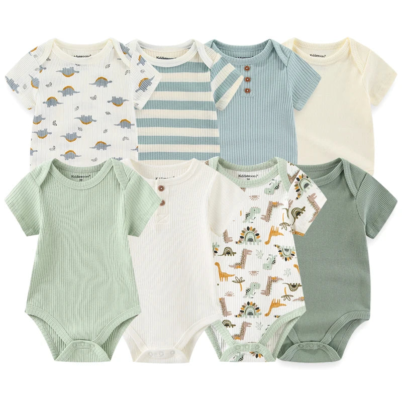 Antwort 1: Die Bodysuits bestehen aus hochwertiger, weicher und atmungsaktiver Baumwolle, die sanft zur empfindlichen Haut Ihres Babys ist. Sie haben ein trendiges Kurzarm-Design, das ideal für warme Tage ist, und verfügen über eine praktische Knopfleiste für einfaches An- und Ausziehen.